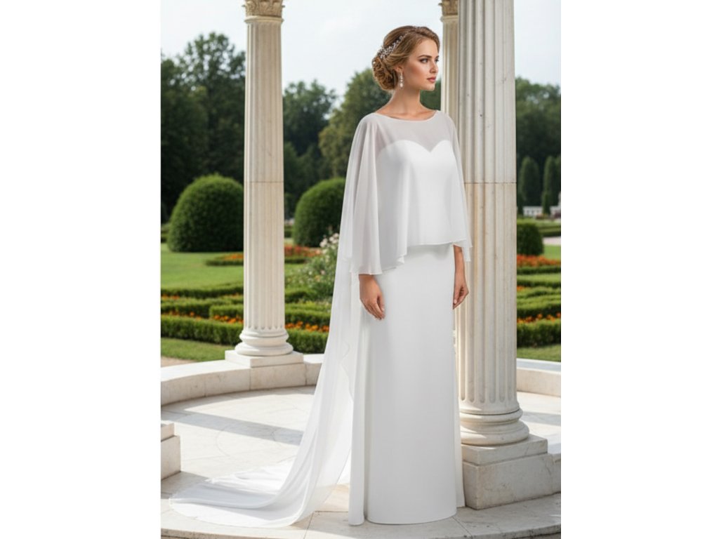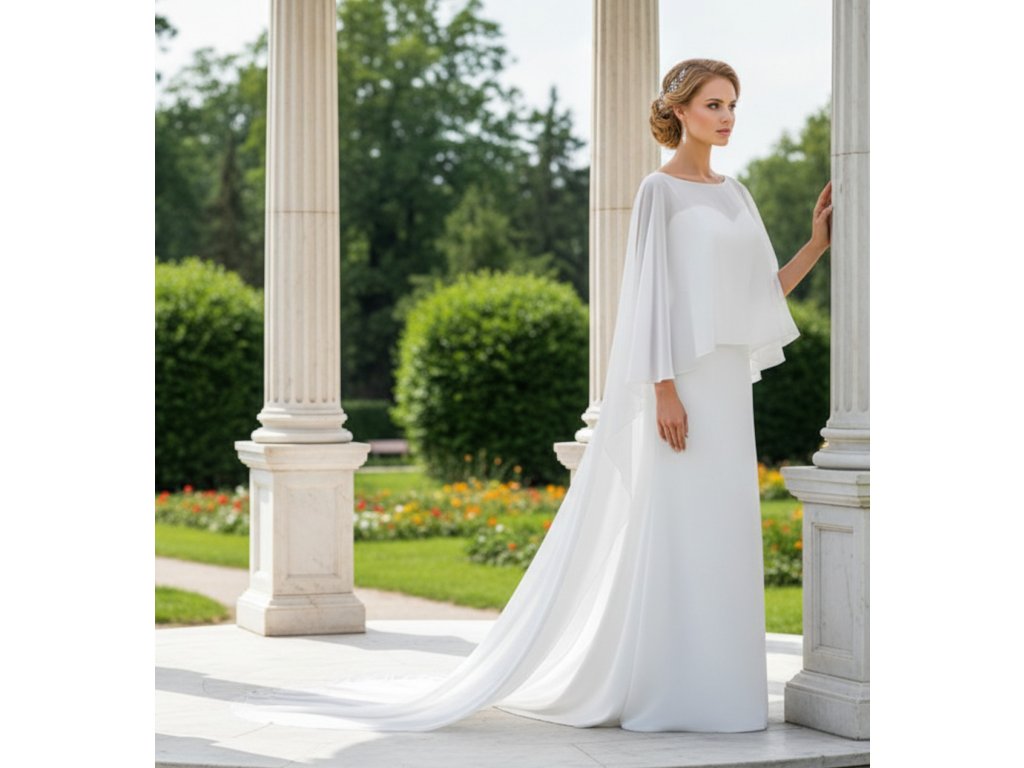 Dlouhá mušelínová svatební pelerína s vlečkou.
