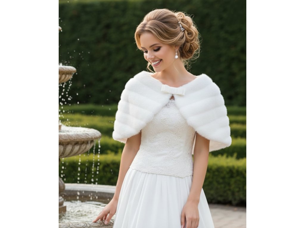Svatební pelerína s úzkou mašlí, vyrobená z umělé kožešiny.