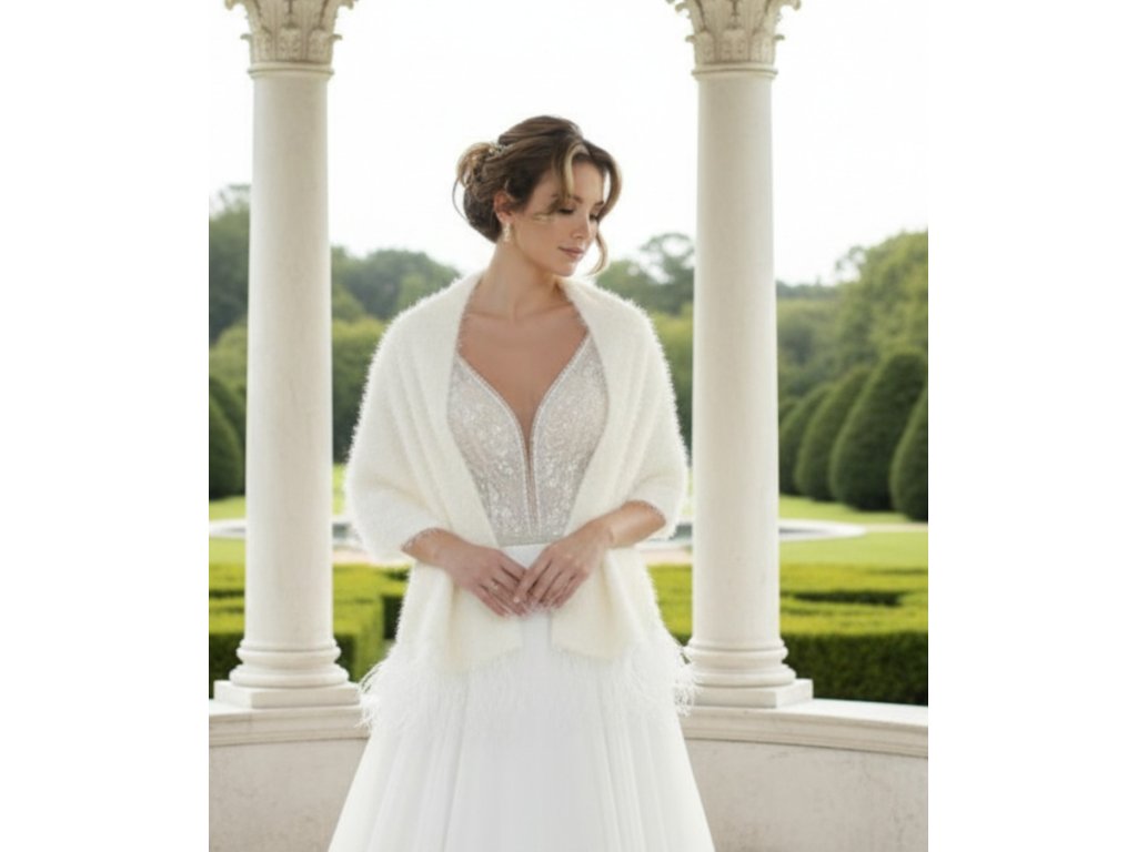 Pleteninový svatební šál z tkaniny Mikado. Šál je na koncích zdobený peříčky.