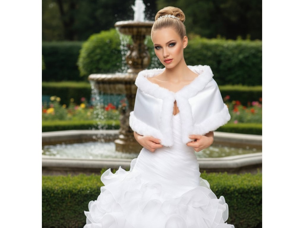 Taftová svatební pelerína lemovaná umělou kožešinou.