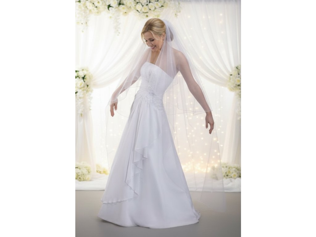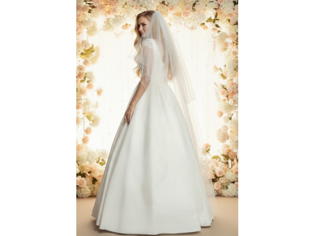 Délka závoje je 90/170 cm, šířka 250 cm.