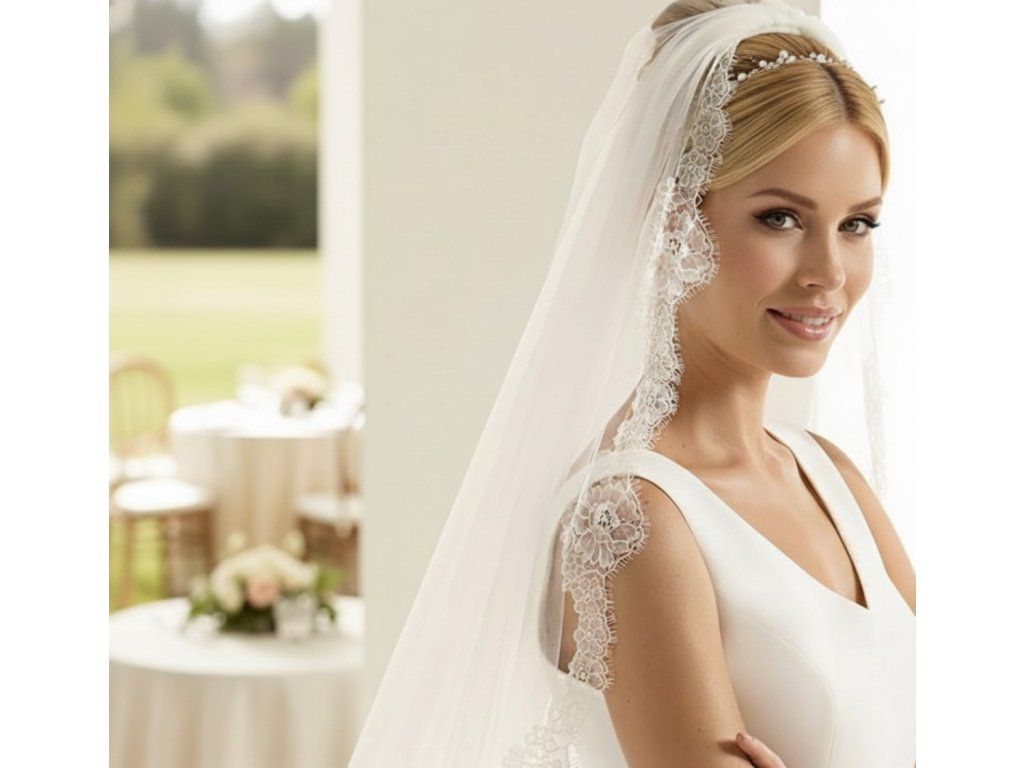 Dlouhý jednovrstvý svatební závoj lemovaný jemnou pavučinkovou krajkou.