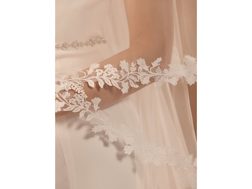 Dlouhý dvouvrstvý svatební závoj s krajkovým lemem.