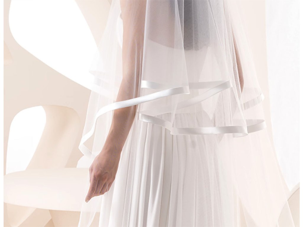 Dlouhý svatební závoj lemovaný saténovou stuhou.