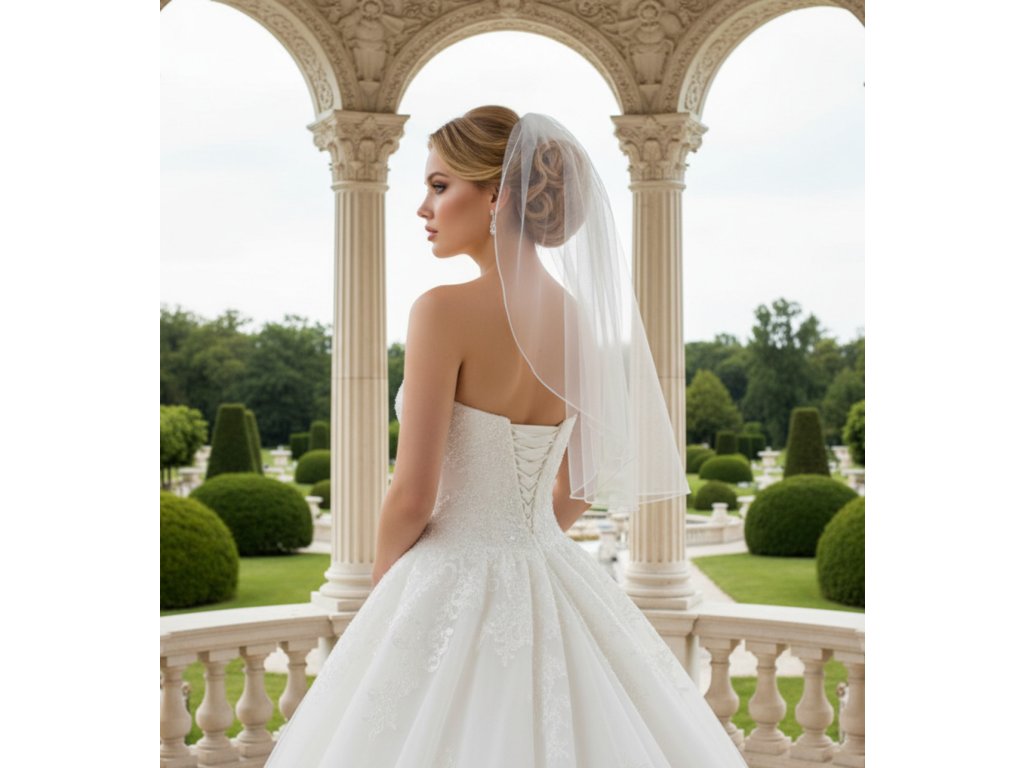 Délka svatebního závoje je 80 cm, šířka 140 cm.