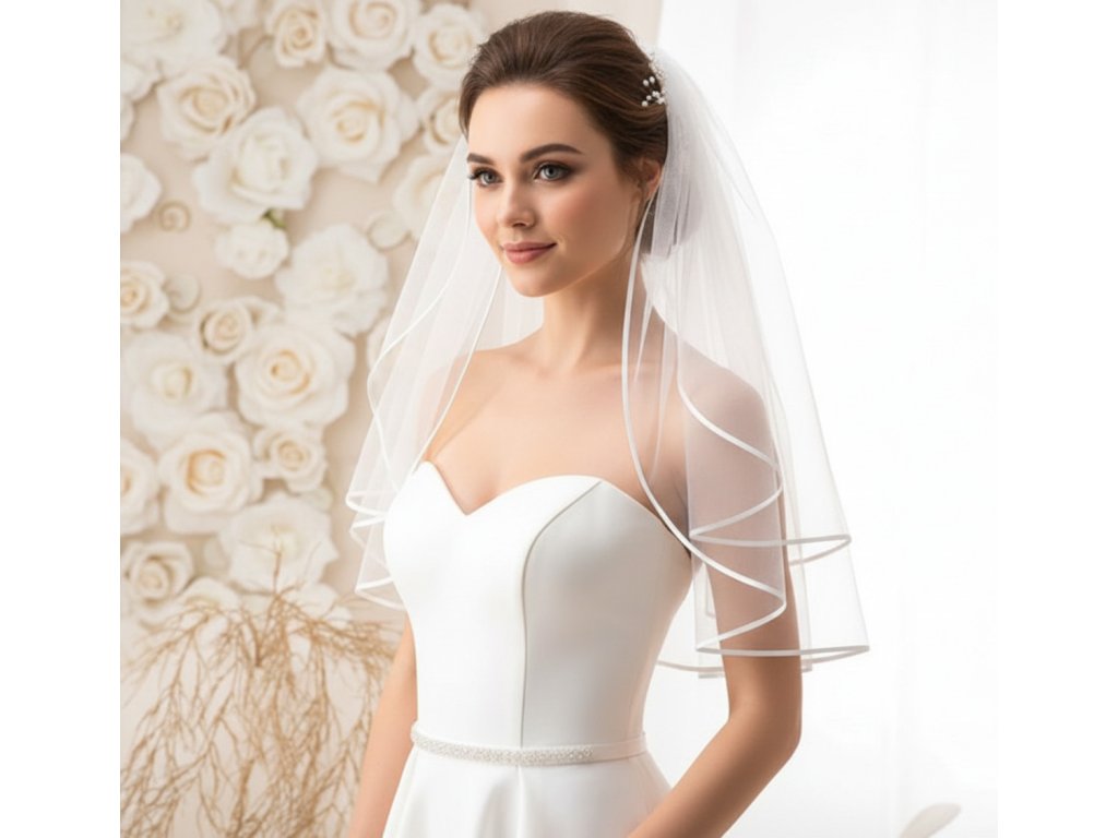 Krátký svatební závoj se saténovým okrajem.