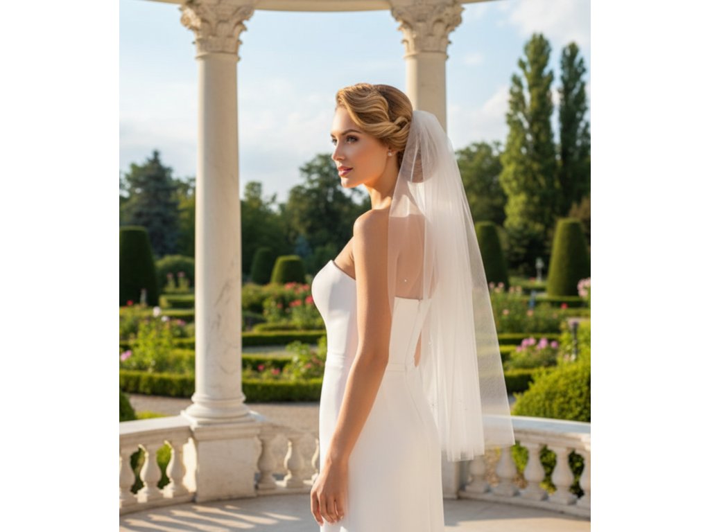 Svatební tylový závoj bez lemování, zdobený jemnými krystaly.