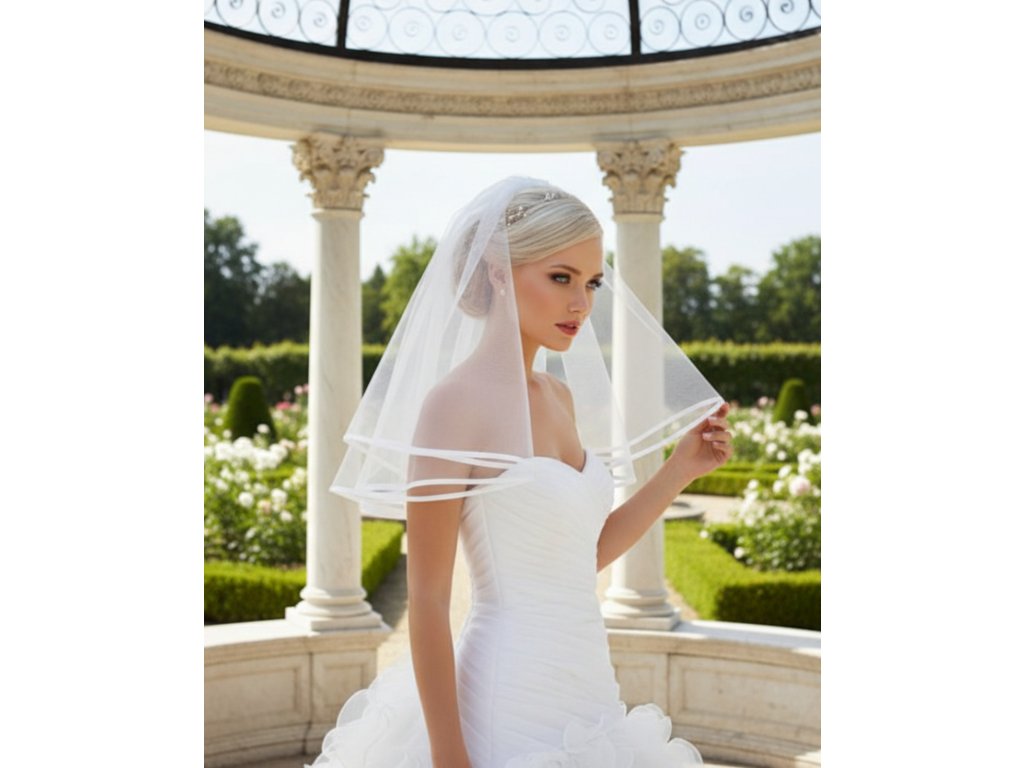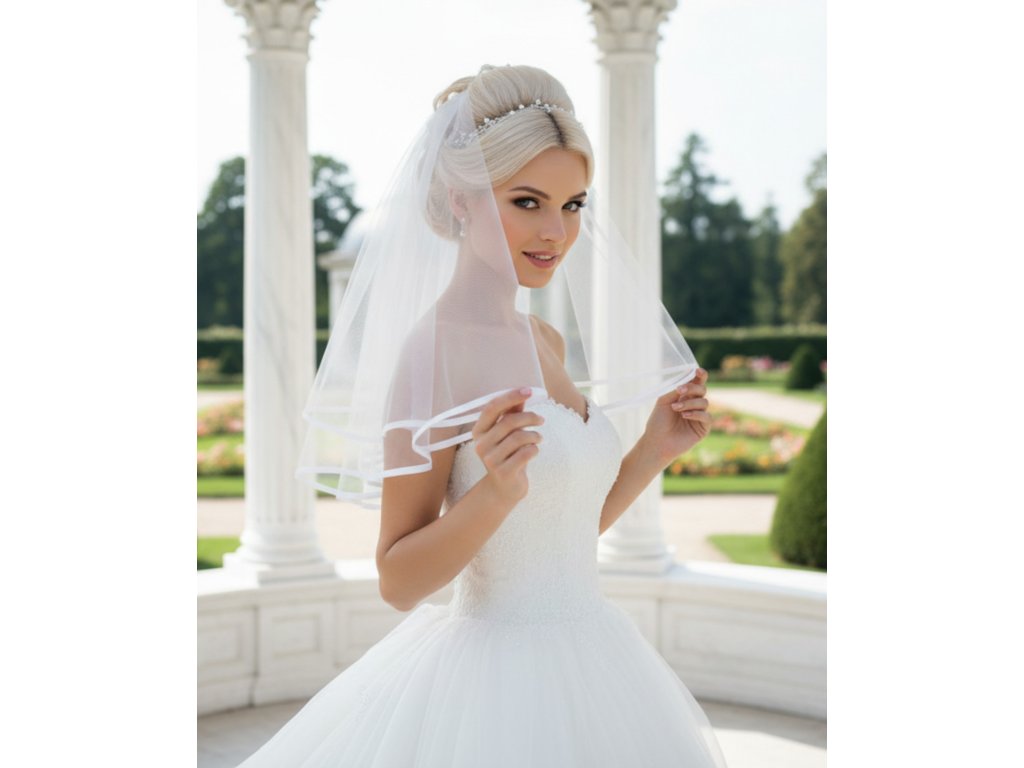 Délka svatebního závoje je 60/50 cm, šířka 140 cm.