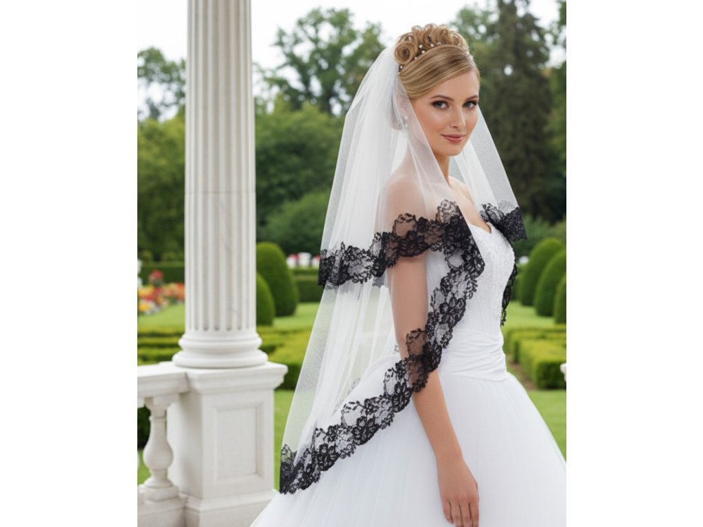 Svatební závoj s černým krajkovým lemem.