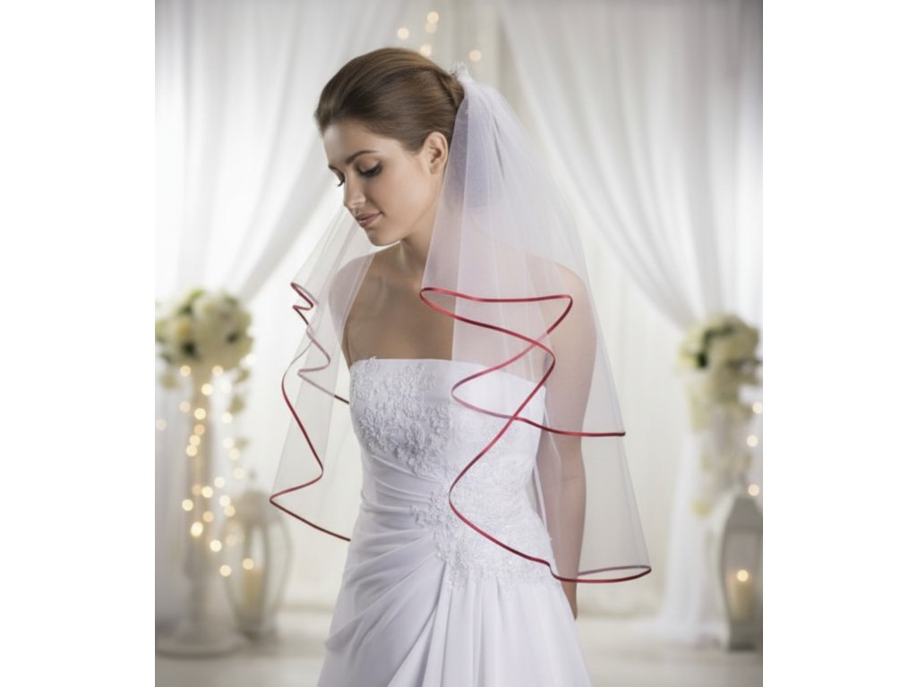 Svatební závoj s červeným saténovým lemem.