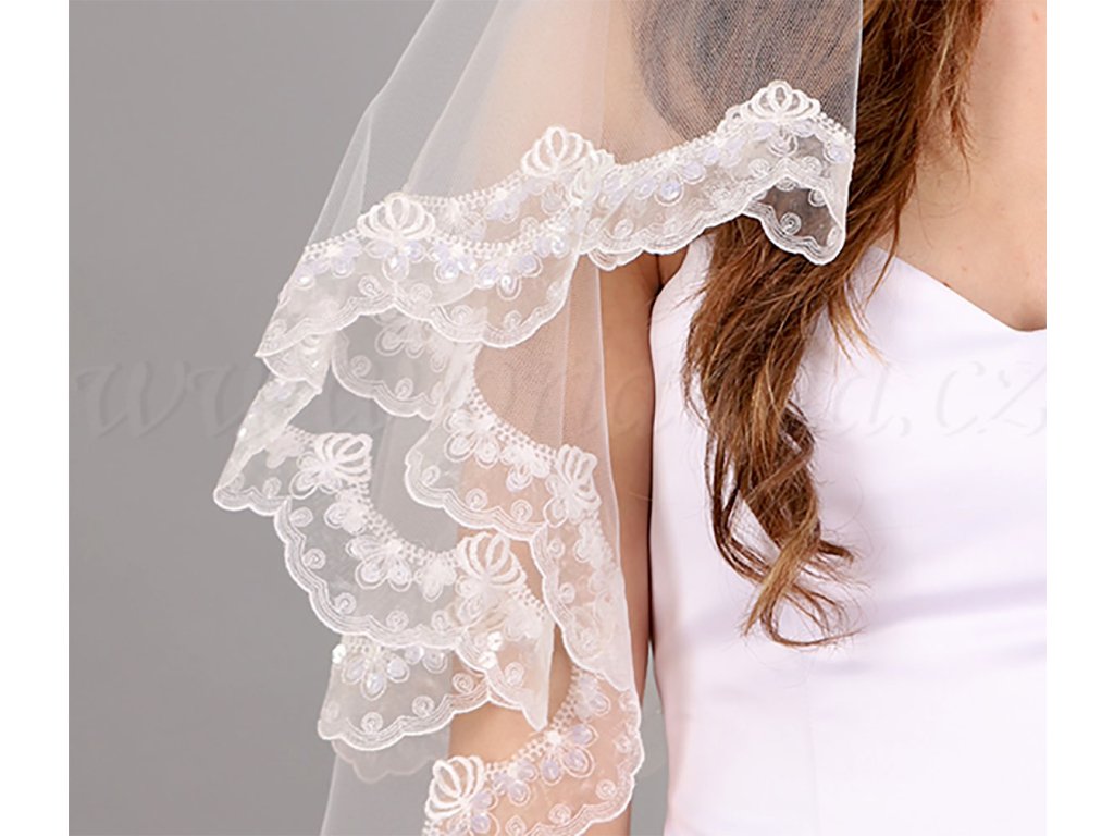 Dvouvrstvý svatební závoj s krajkou. Krajka je zdobená jemnými flitry.