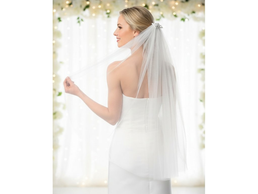 Jednoduchý tylový svatební závoj bez lemování, zdobený mašlí na hřebínku.