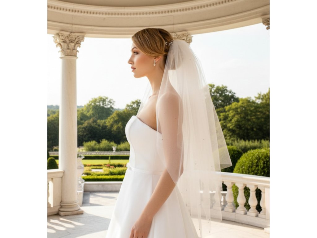 Třívrstvý svatební tylový závoj bez lemování, zdobený krystaly.